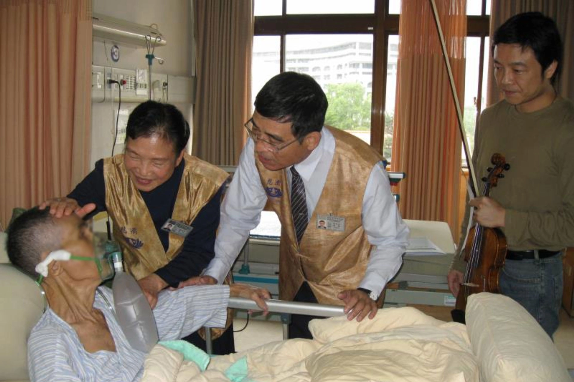 在花蓮慈濟醫院醫院,志工徐水田(中)與同修徐林滿里(左)關懷病患,及帶來小提琴家林錫隆(右)以樂會友,撫慰病苦。(攝影:周中慧)