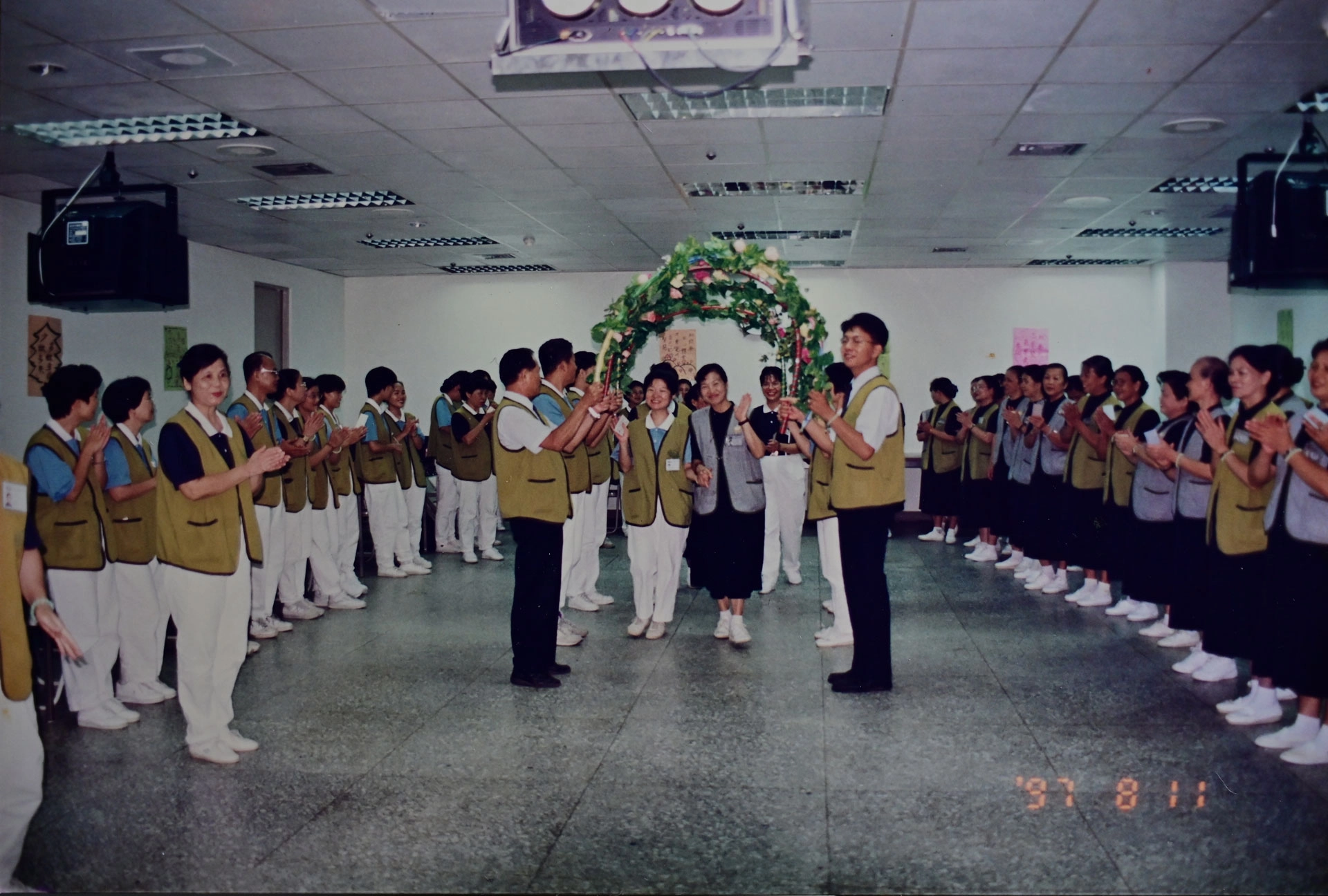 教聯會老師參訪花蓮慈院,徐林滿里(拱門下右一)於醫院大廳溫情迎接法親家人。(1997/08/11;圖片來源:徐林滿里提供)
