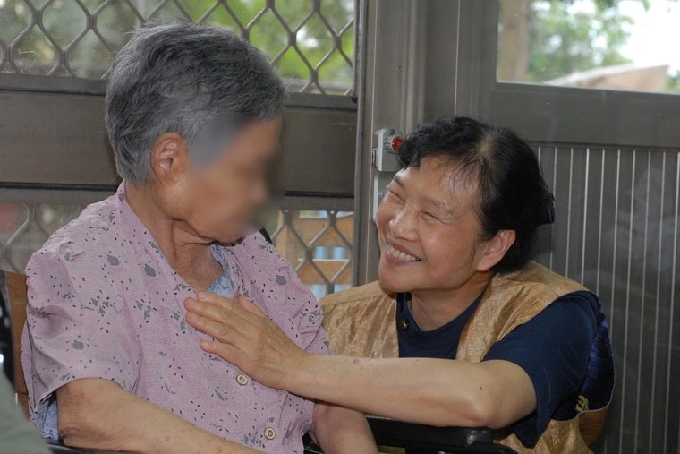 臺中縣豐原市健安老人養護中心關懷,林滿里親切地用掌心拍拍阿媽的胸口,讓阿媽安心。(2008/05/22;攝影:林昭雄)