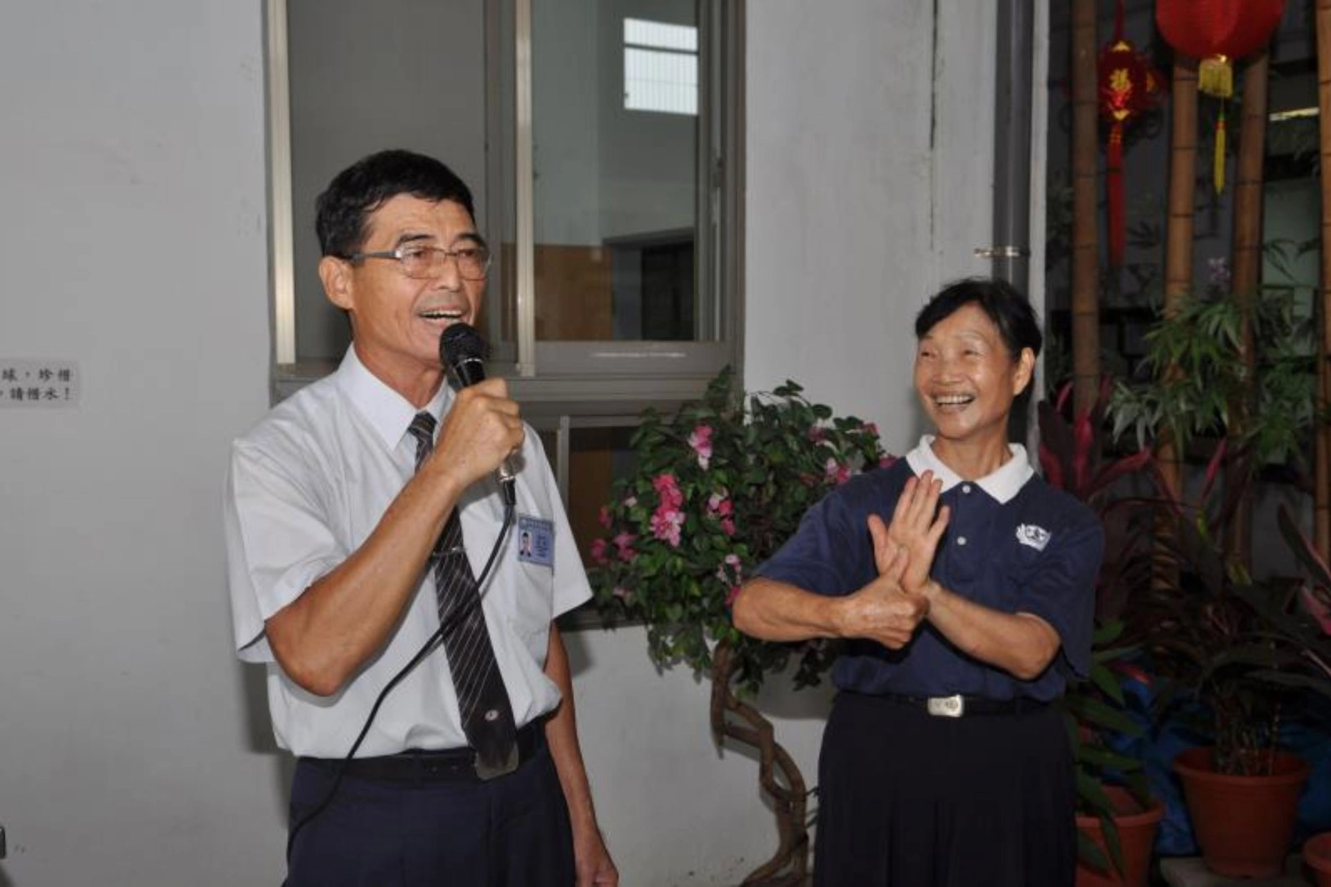 臺中慈濟志業園區內,徐水田(左)哼唱著歌曲,同修徐林滿里(右)則負責比手語,與工地朋友同樂。(2010/06/24;攝影:曾東勝)