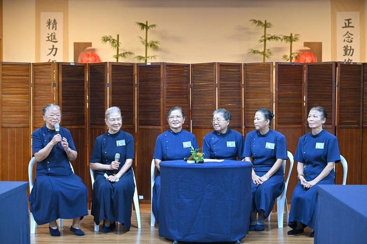 在臺中靜思堂舉辦的「全台醫療巡迴溫馨座談」中,資深醫療志工徐林滿里(左二)回首服務趣事,投入醫療志業逾三十年,走出迷信更堅定信念。(2025/09/23;攝影:李彥緰)