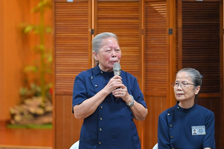 八十五歲的江含消(左)雖然不識字,但她懂得跟緊證嚴上人,學習行善付出。(2025/09/23;攝影:李彥緰)