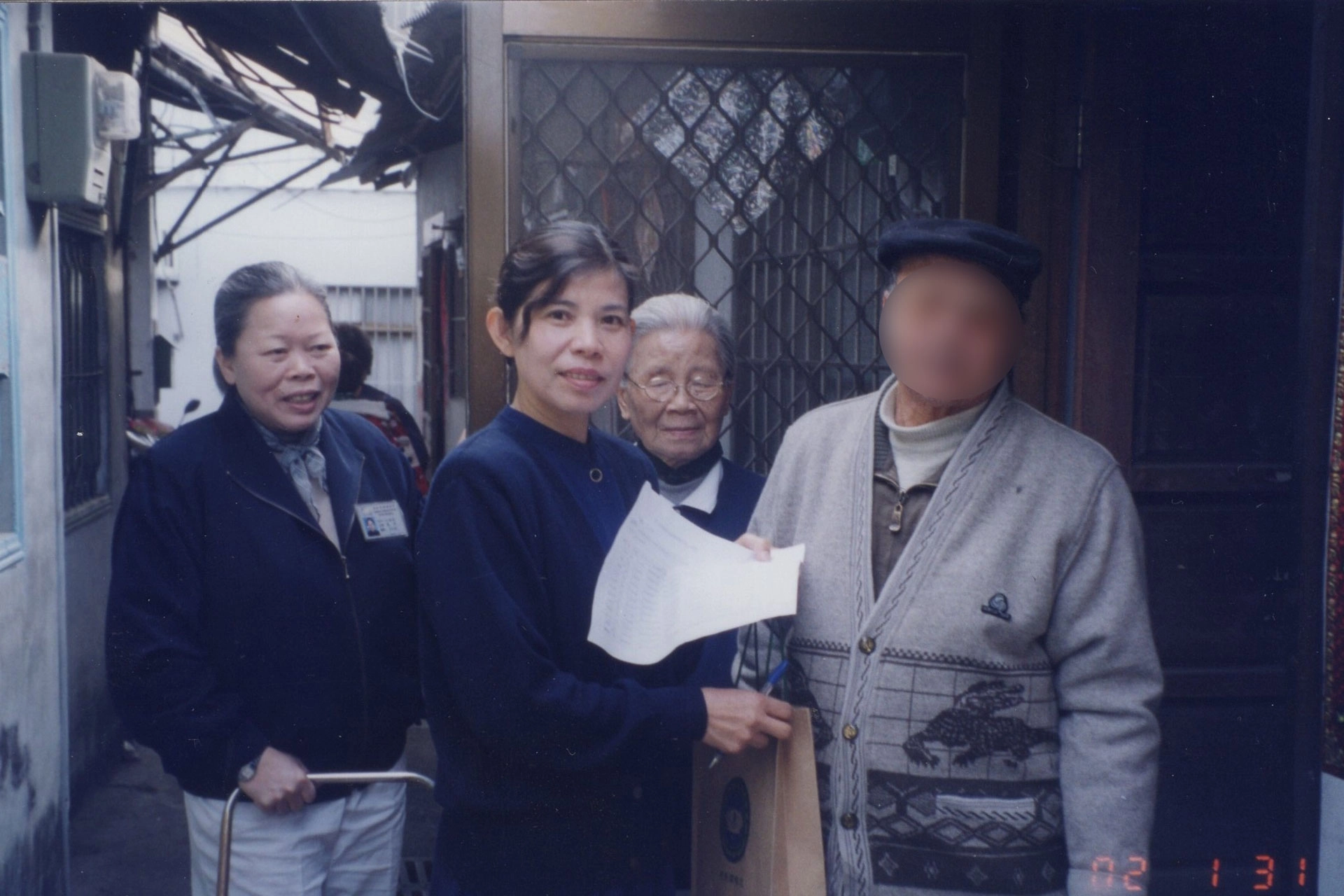 資深志工江含消(後左)、李僅(後右),陪同正在培訓的林淑懷(前左)家訪,送農曆新年物資。(圖片來源:黃秀枝提供)