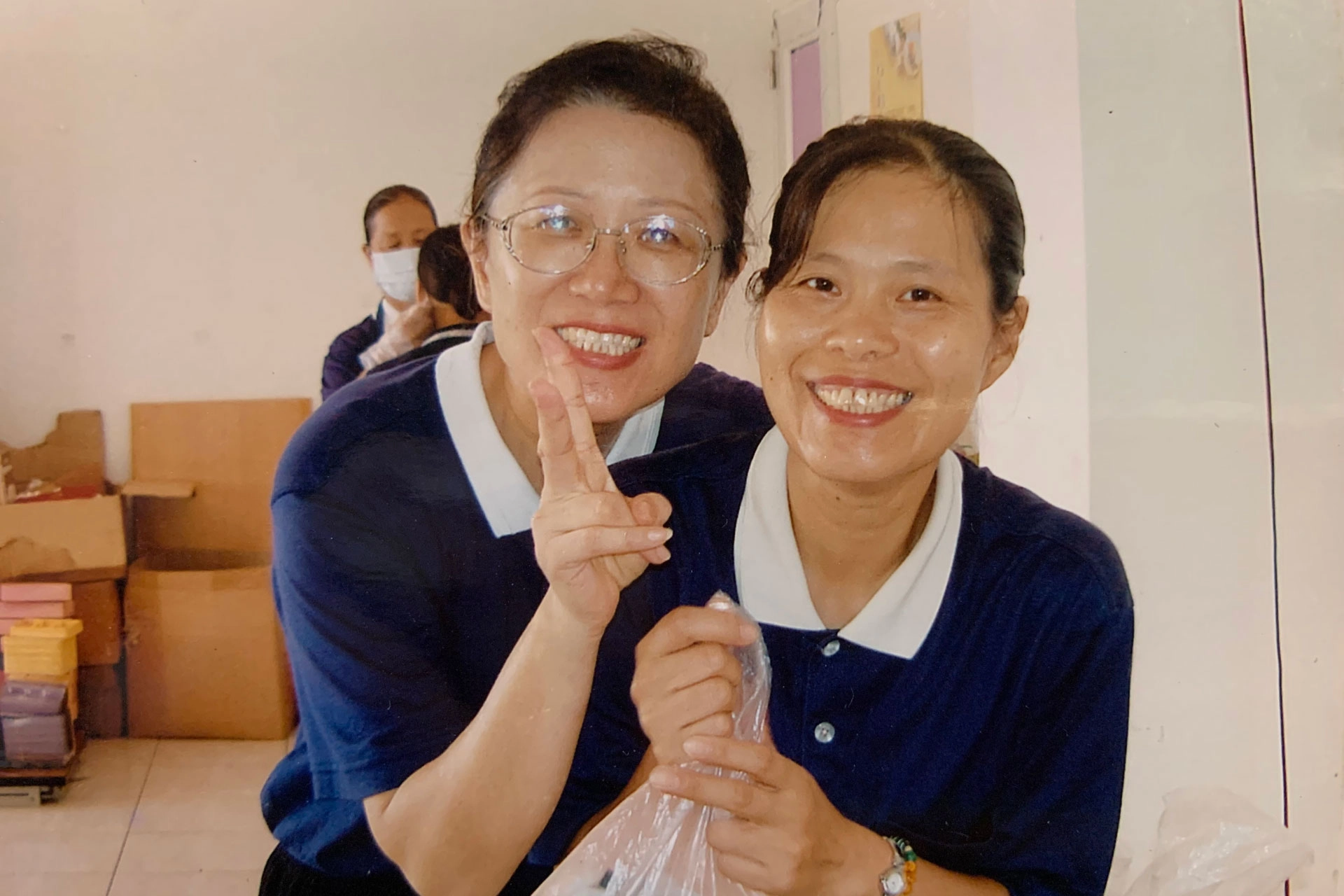 鄭粧師姊(左)在曾美玉培訓委員時勉勵她「勇於承擔、樂於配合」,這句話讓曾美玉銘記至今,也讓她始終感恩同行法親的陪伴,視鄭粧為人生中的貴人。(圖片來源:曾美玉提供)