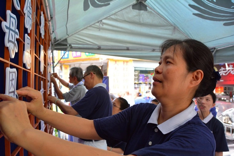 新竹縣竹北市浴佛典禮中,曾美玉與慈濟志工於熱鬧的仁義市場舉辦浴佛活動,眾人用心布置會場,迎接莊嚴法會的到來。(2016/05/07;攝影:王芮雯)