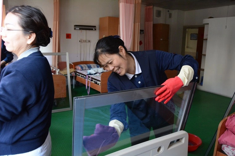 農曆新年將至,曾美玉與慈濟志工協助竹北安養中心打掃環境,讓長者能在乾淨的環境中,平安、健康度過每一天。(2015/02/14;攝影:王芮雯)
