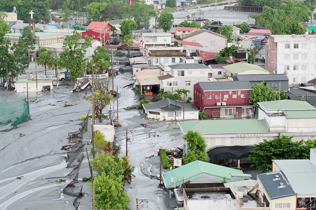 村中的房屋被泥沙掩蓋,只剩屋頂外露,雖然積水稍有退去,但雨勢不斷,水流和泥沙仍持續湧進。(攝影:陳榮豐)