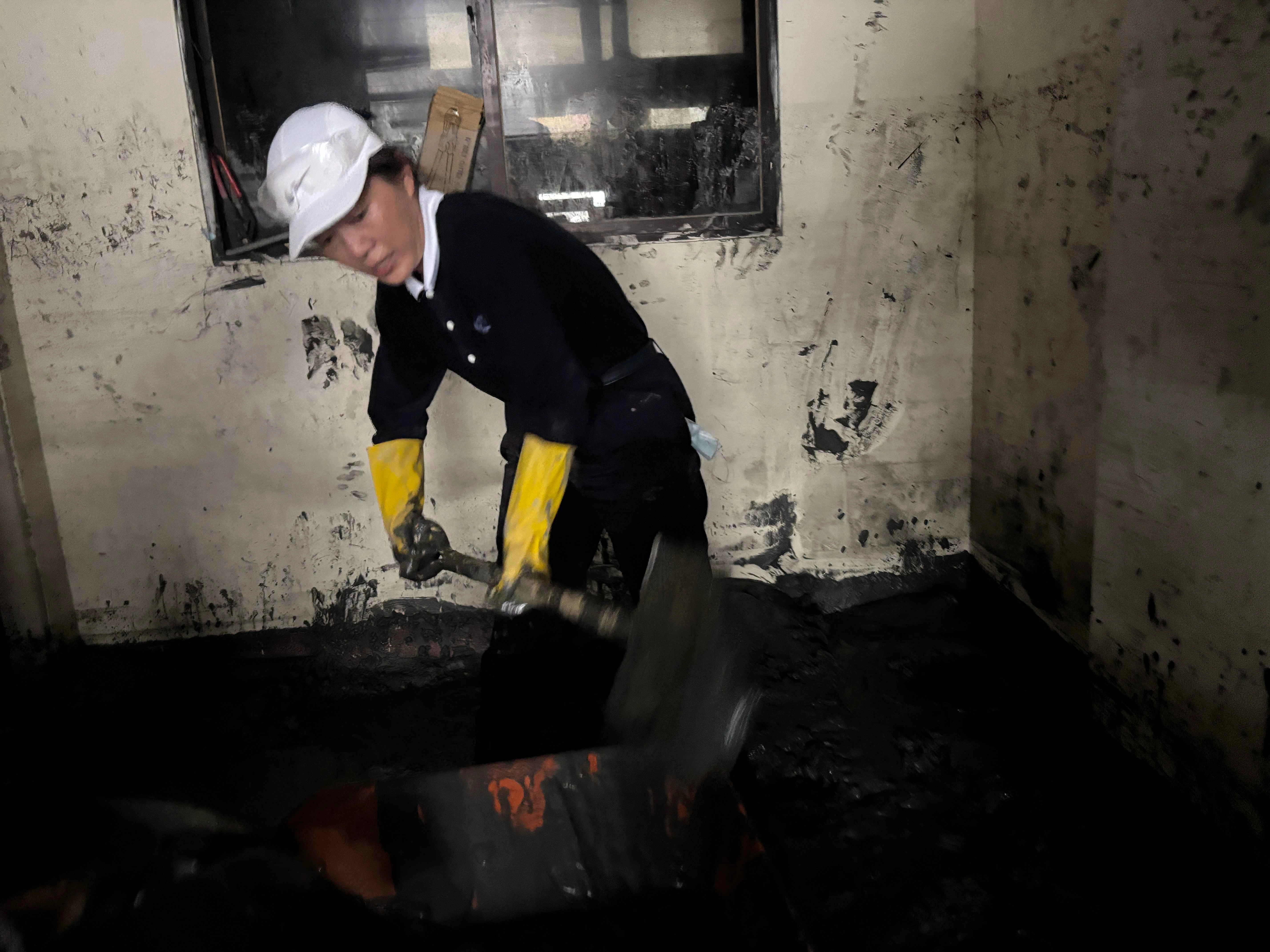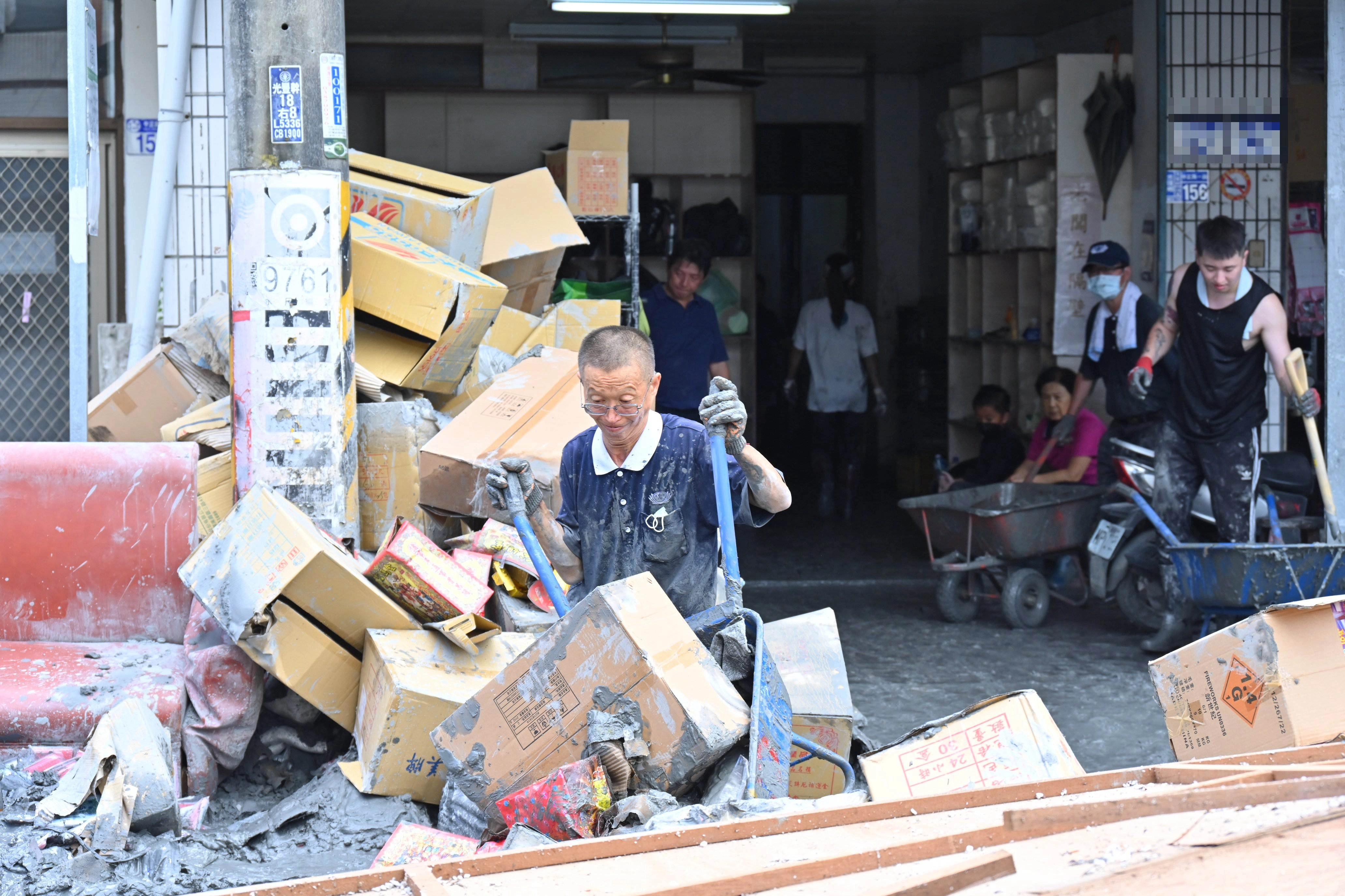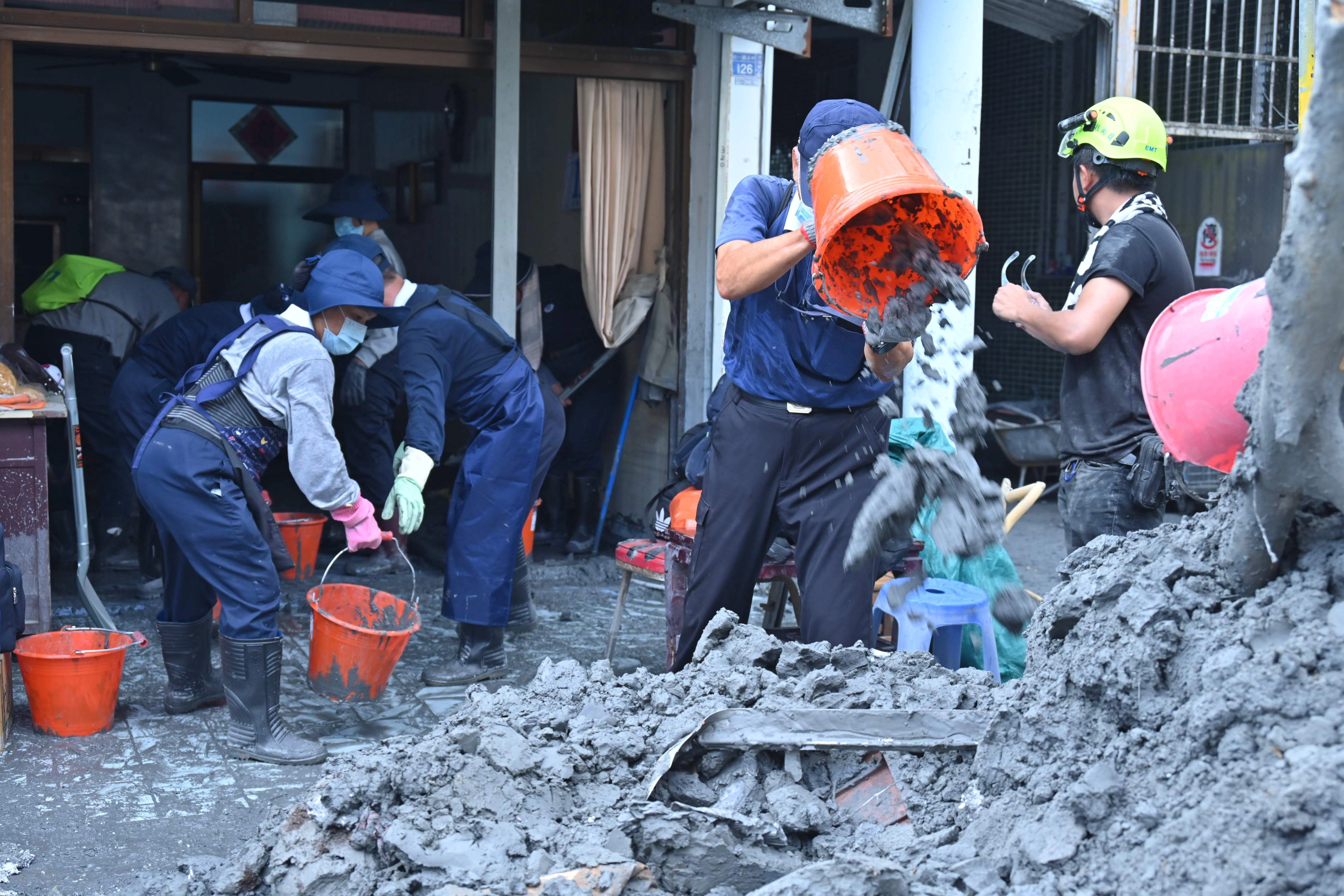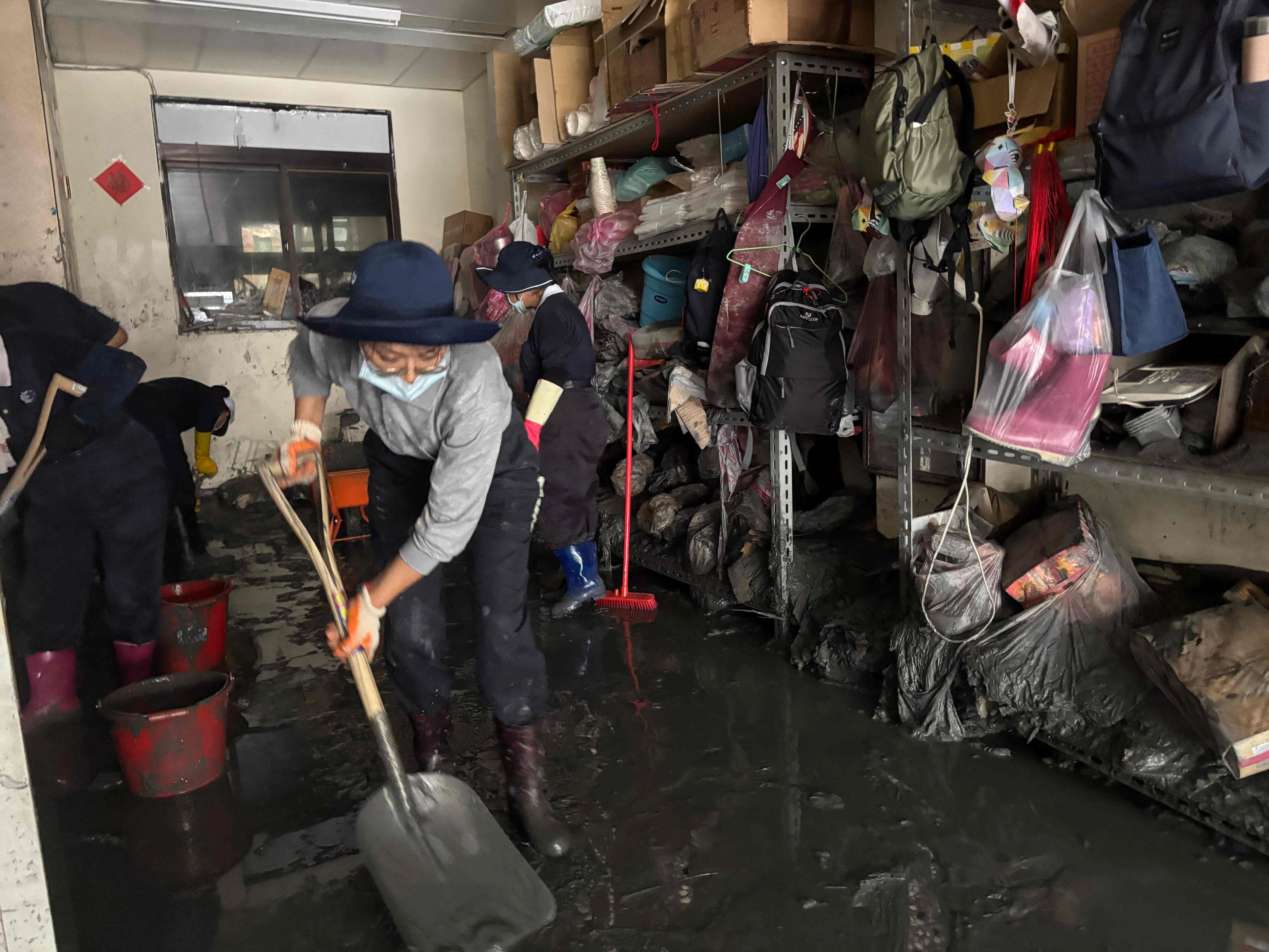 我們清掃的一戶,是中正路上一家大型金紙、免洗碗筷批發店,橫跨兩間店面,屋內深邃,長條型的結構,走道僅可容一個人身。倉庫的置物架上滿是金紙、鞭炮、沖天炮和煙火炮。由於地勢低窪,泥水帶土往內沖,進得來就出不去了。