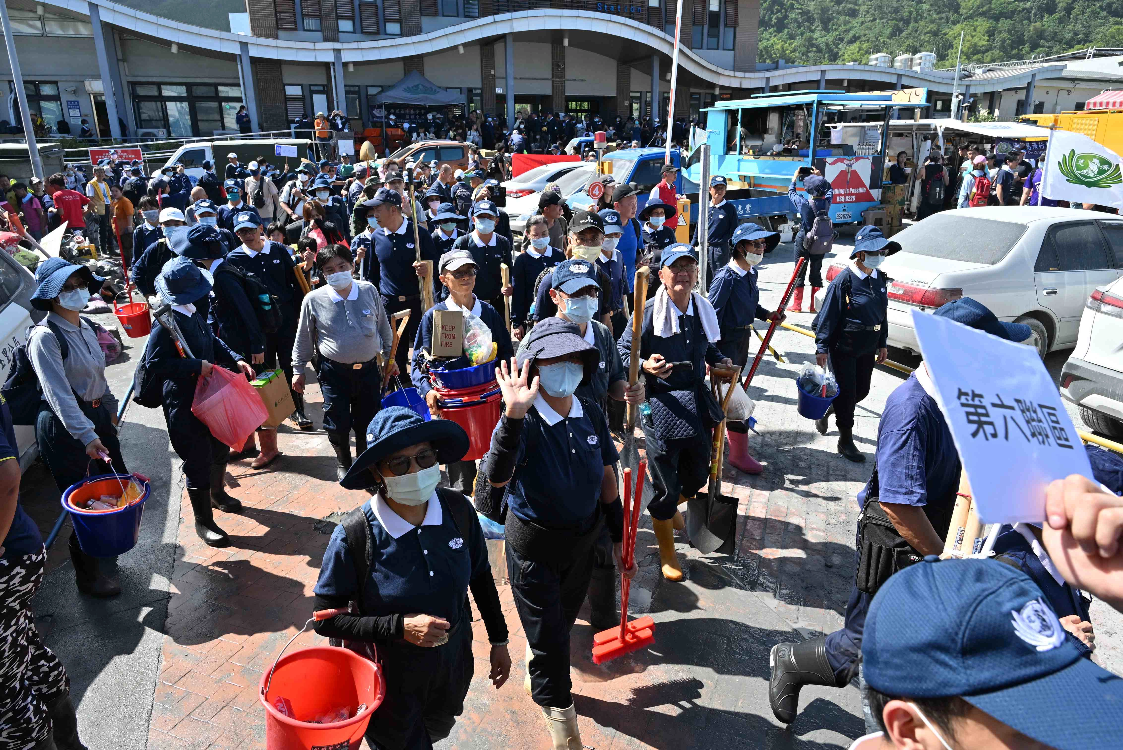 女眾有的繫護腰、有的圍上圍裙、套上臉罩,配備齊全,準備與泥水奮戰三天。(攝影/張麗雲)