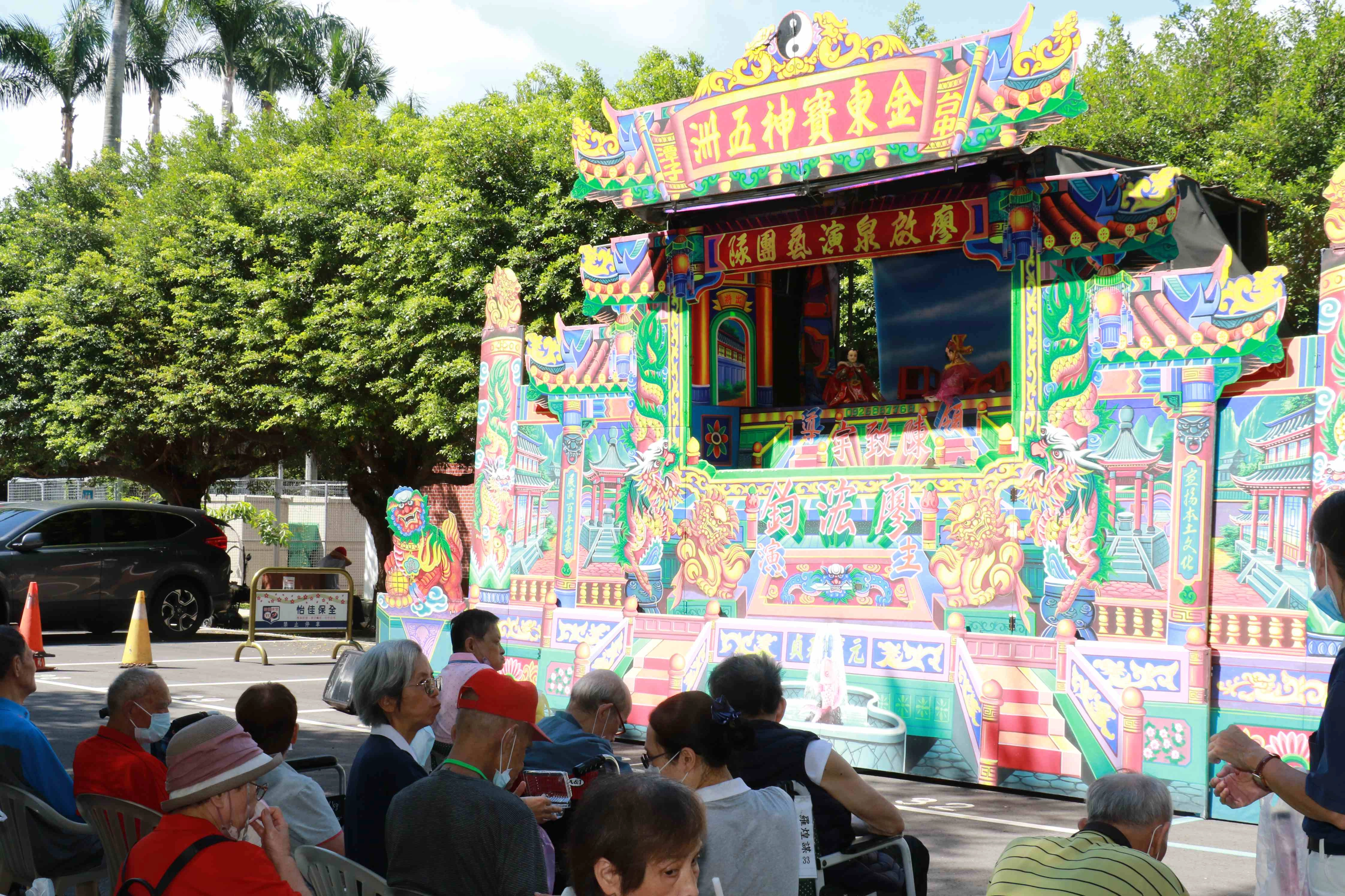 蕭隆澤市議員邀請布袋戲團表演,吸引長輩圍坐觀賞。(圖片來源:台中慈院公傳室)