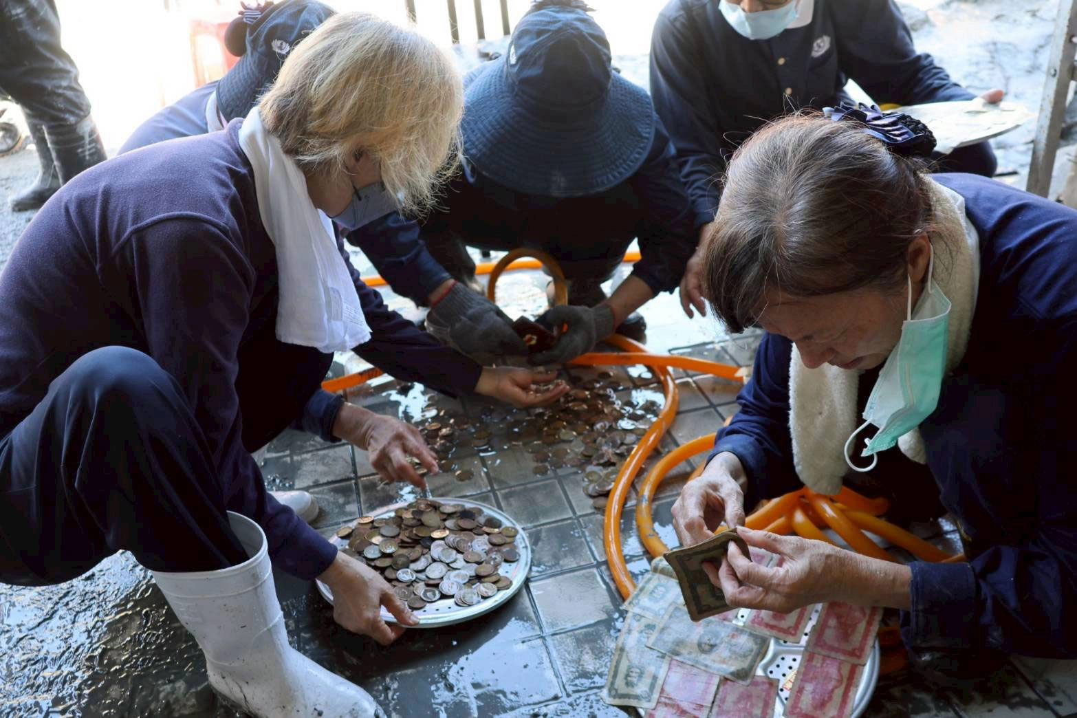 另一批志工何芙蓉等人,則將一整提鍋的紙鈔、銅板帶到店門口,蹲在地上細心清洗,並將紙鈔一一攤開晾乾。