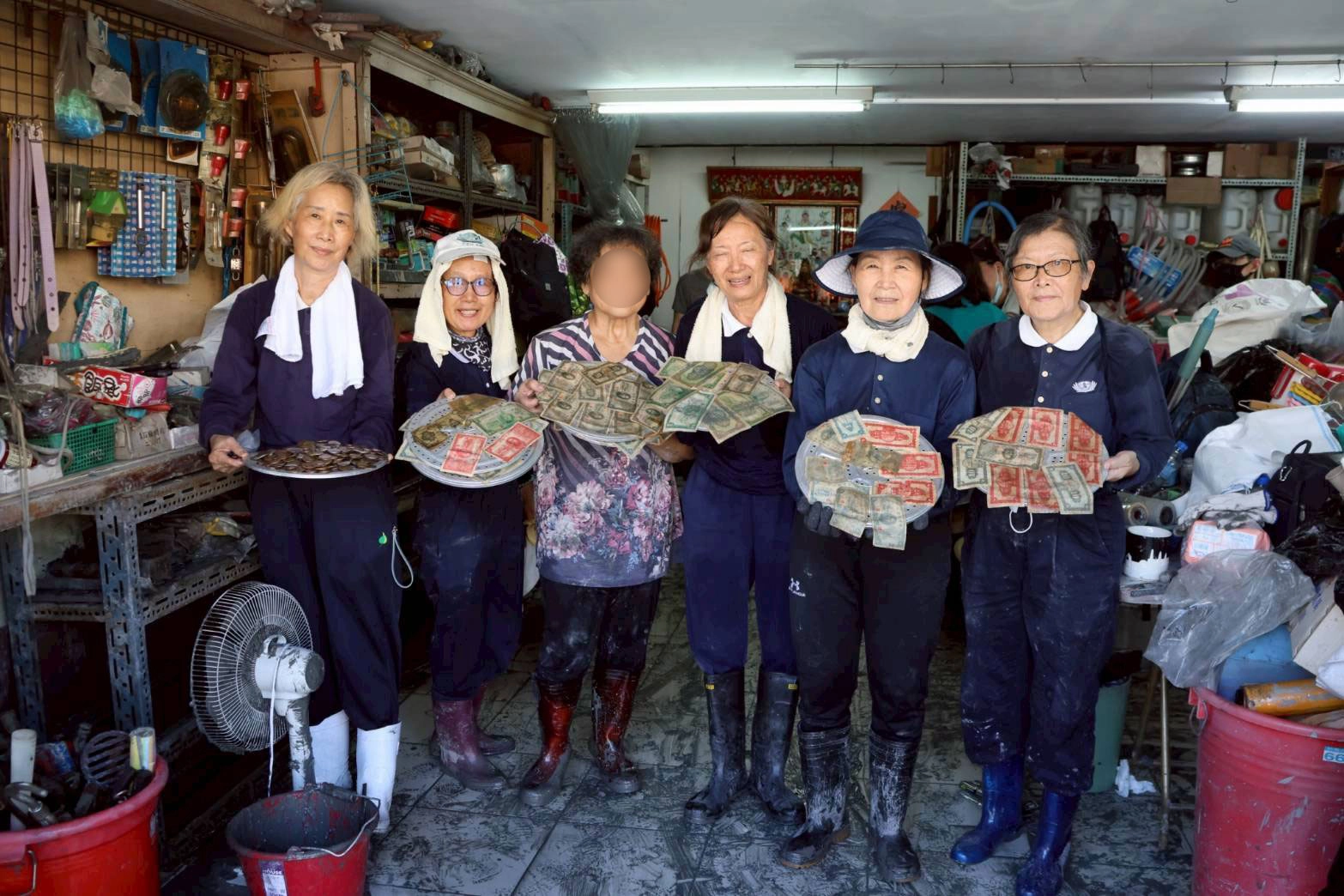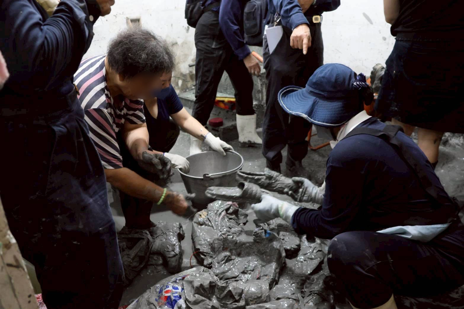 志工彎下身,以最溫暖的心,陪著阿媽在一抔抔爛泥中一一翻找這些寶貝。