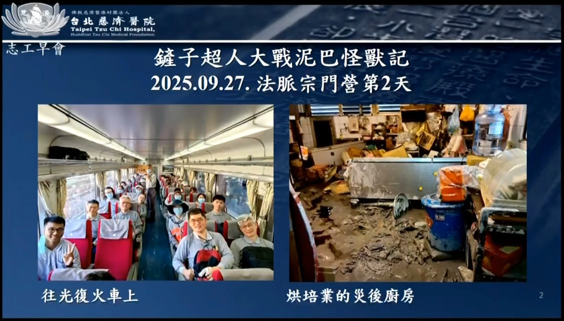 案家因為從事烘焙業,擁有很多機器、包裝盒,以及收藏的各種物品,全部都泡了水,必須一一搬出來,真的是堆積如山。一位師姊推著獨輪車,裡面裝滿泥巴,非常沉重。本來我們以為這種事只有男眾才做得到,但實際上,女眾也可以承擔。這印證了男人女人都可以當超人用,只要願意去做,人真的有無限的可能。