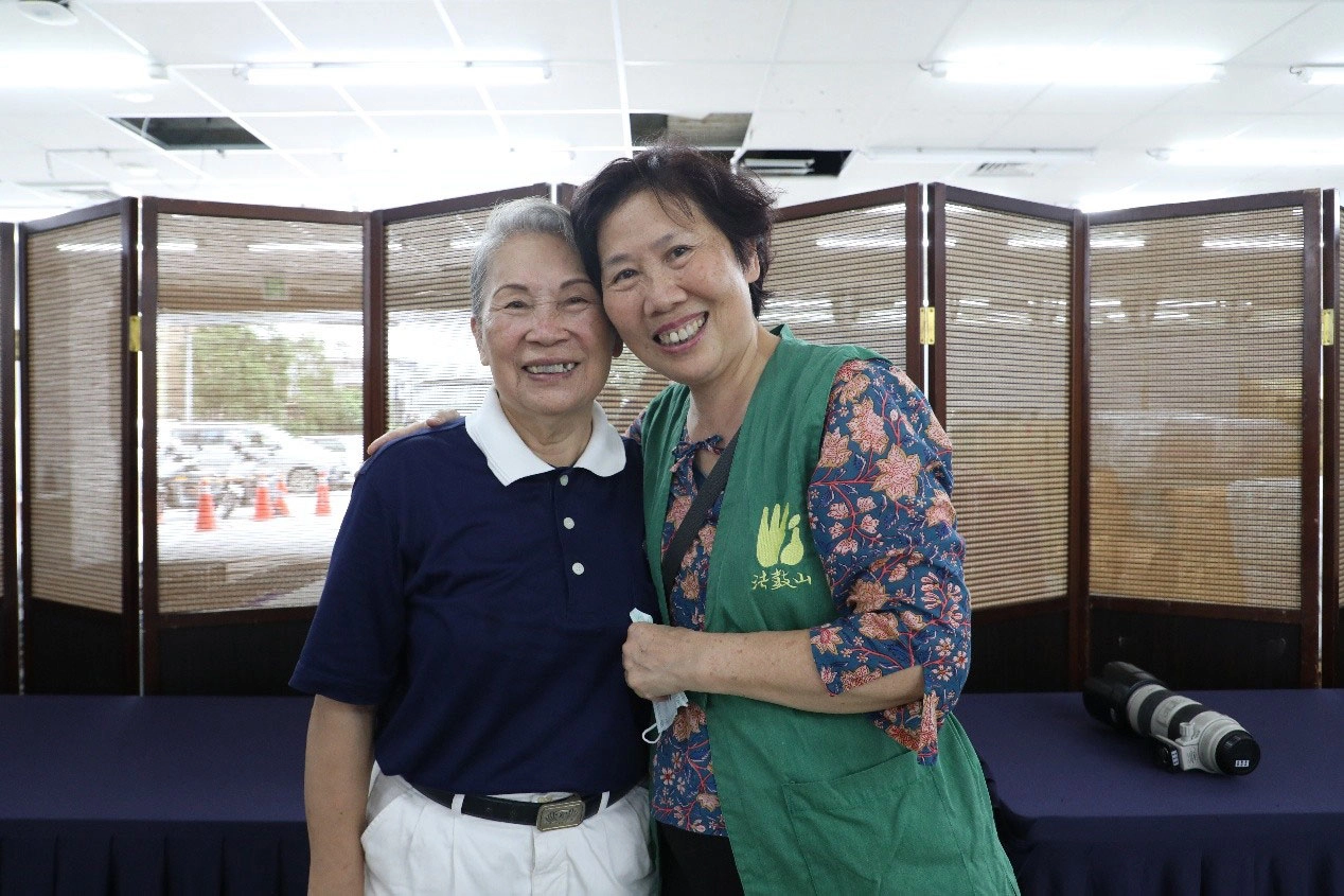 活動當天,場外設有芳療及筋骨舒緩體驗,除了芳療師外,還有兩位法鼓山的志工。其中一位志工蔣素娥師姊,一走進茶會現場,就被慈濟志工林惠美認出,原來兩人是三十年未見的好友,相見格外興奮,不約而同將彼此擁入懷中!