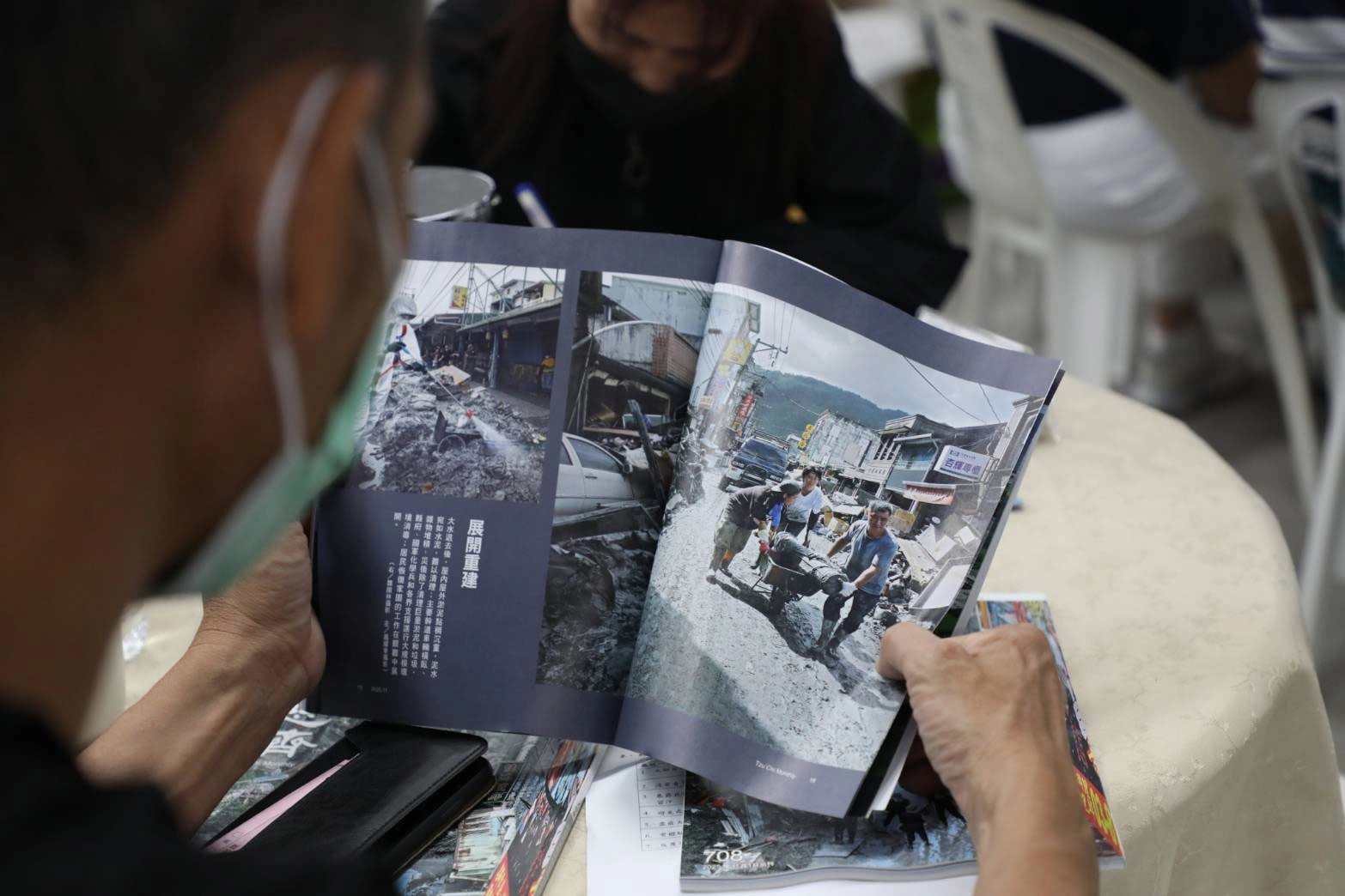 鄉親專注翻閱《慈濟》月刊。這場由玉里組隊用心規劃的愛灑茶會,撫慰受災鄉親的心,讓他們知道慈濟的愛始終相伴。(攝影:陳靜惠)