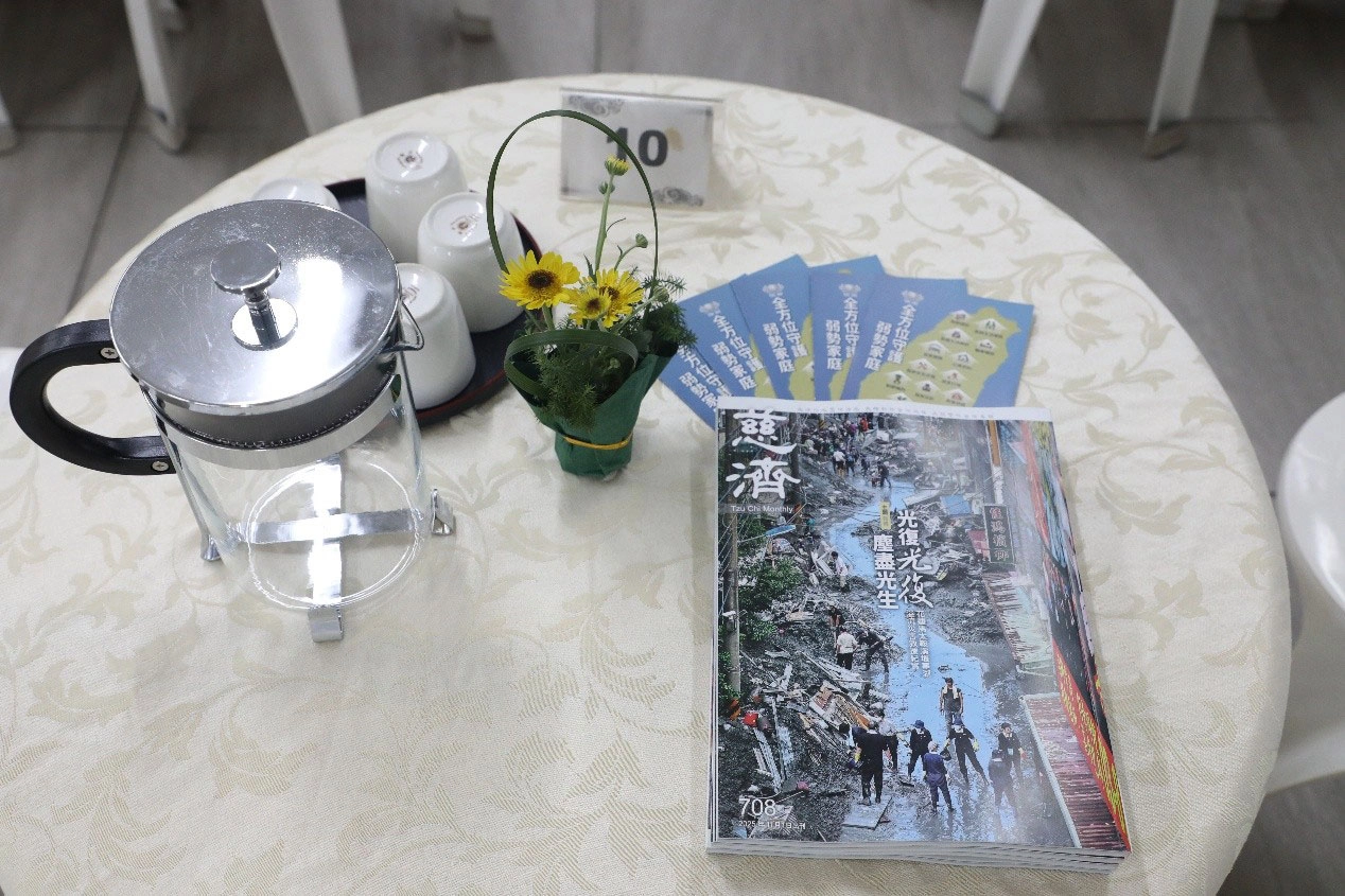 一張張典雅的小圓桌上擺放著《慈濟》月刊,封面映照著滿是泥濘的光復鄉街道。(攝影:陳靜惠)