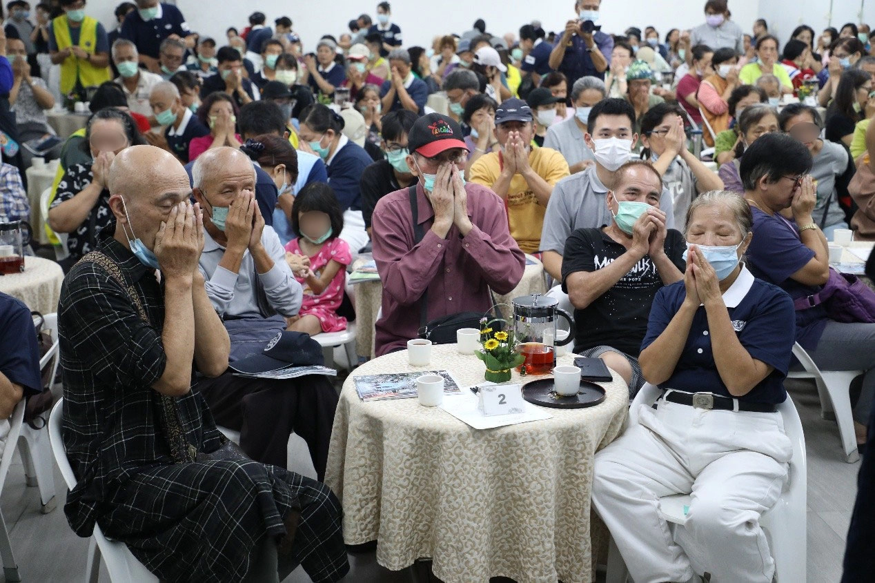 茶會開始,司儀引言後,首先播放一段堰塞湖溢流摧毀光復鄉,以及全台志工與國軍合力為鄉親清理家園的影片。會眾們表情凝重地盯著螢幕,看著畫面中熟悉的街道、家園被泥流吞噬,好幾位鄉親頻頻拭淚,或許是傷心熟悉的家園不再,或是被全台「鏟子超人」暖了心......