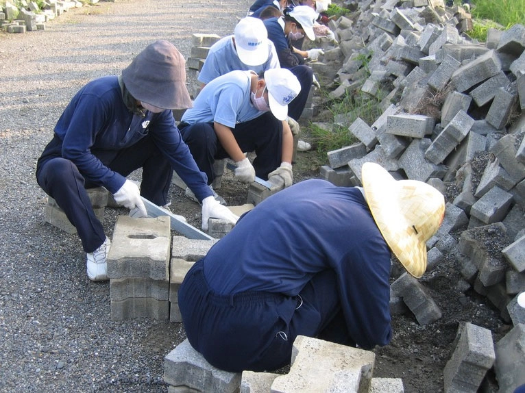 嘉義大林慈濟醫院二期醫護宿舍工程,志工正在刷除附著在連鎖磚上的砂子。(攝影:吳淑麗)