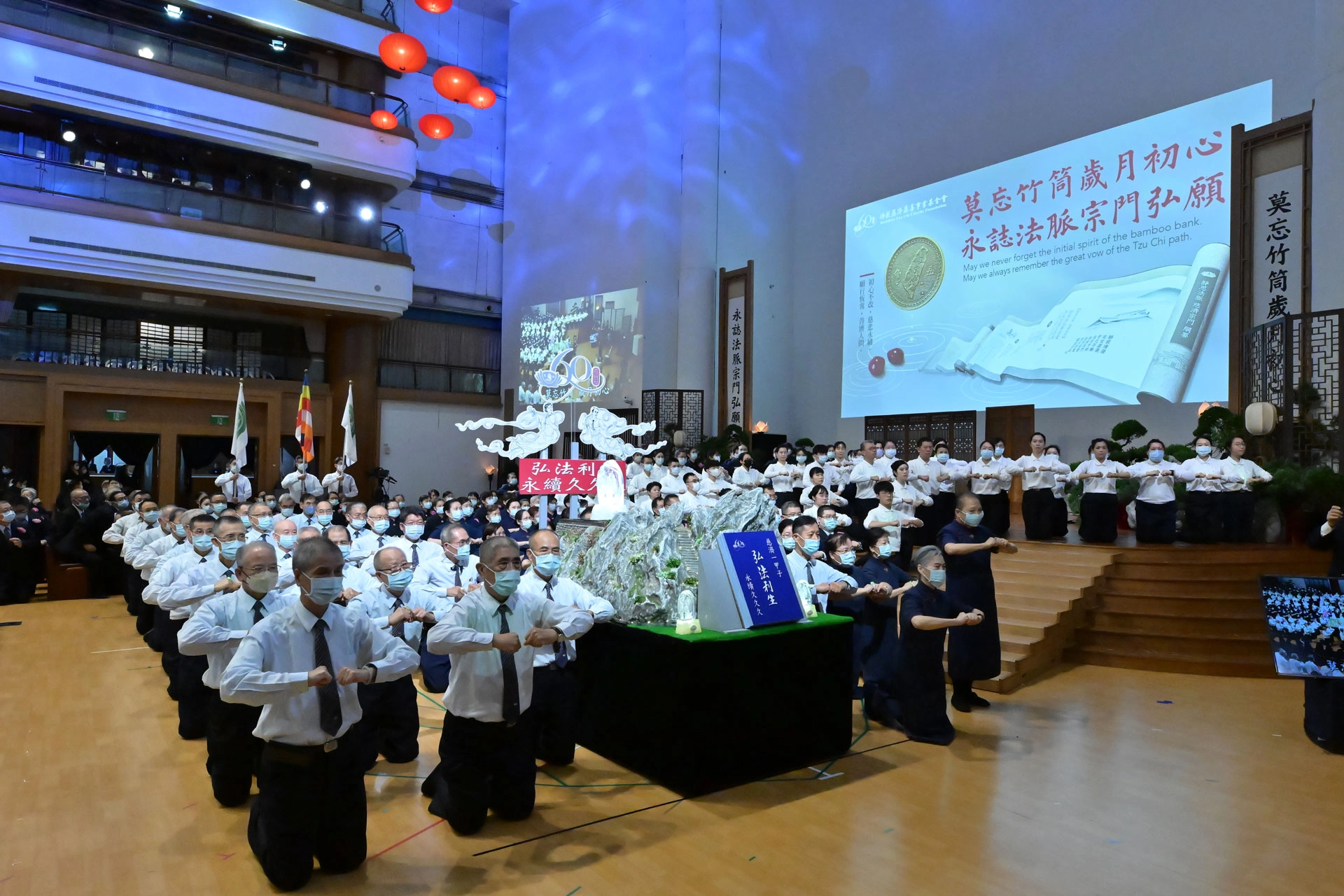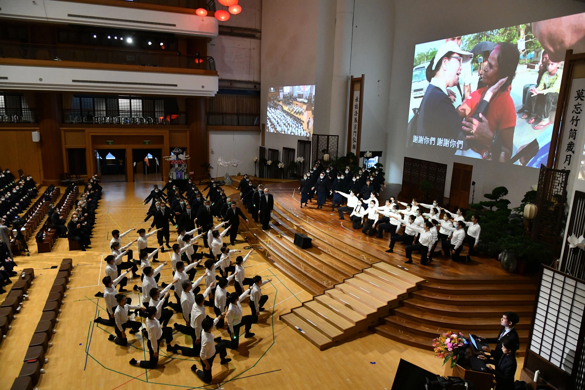 何浩熙(左)與新受證慈誠委員一起在臺上經藏演繹。(攝影:余錦豪)
