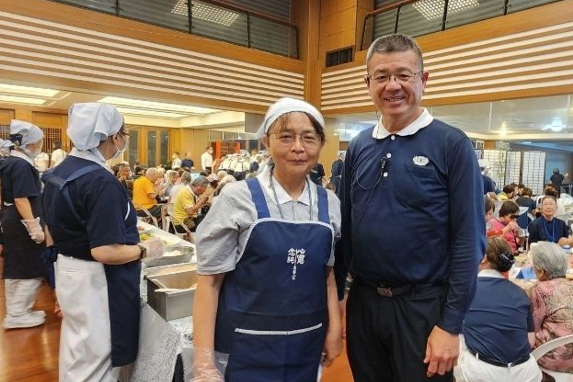 呂沛樺(左)在雙和聯絡處舉辦七月吉祥月祈福會時,協助香積勤務,並與先生葉國榮合影。(圖片來源:葉國榮提供)