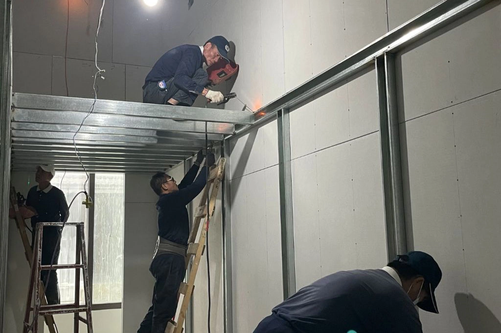 劉智銘(下排中)與慈濟志工一同前往花蓮靜思精舍協力二廠,投入工程協助作業。(圖片來源:劉智銘提供)