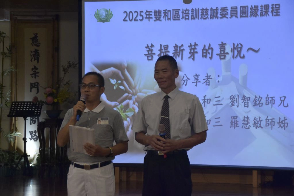 劉智銘(左)於培訓圓緣課中與同期同學分享,他在慈濟這個大家庭中深深感受到一分沒有邊界的愛。(攝影:甘淑怡)