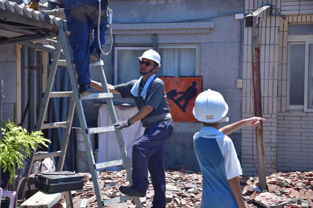 劉智銘在臺北志工陳重光的引介下,帶著兒子來到災區,趁天氣良好完成修繕工作,盡一分心力。(攝影:陳盛英)