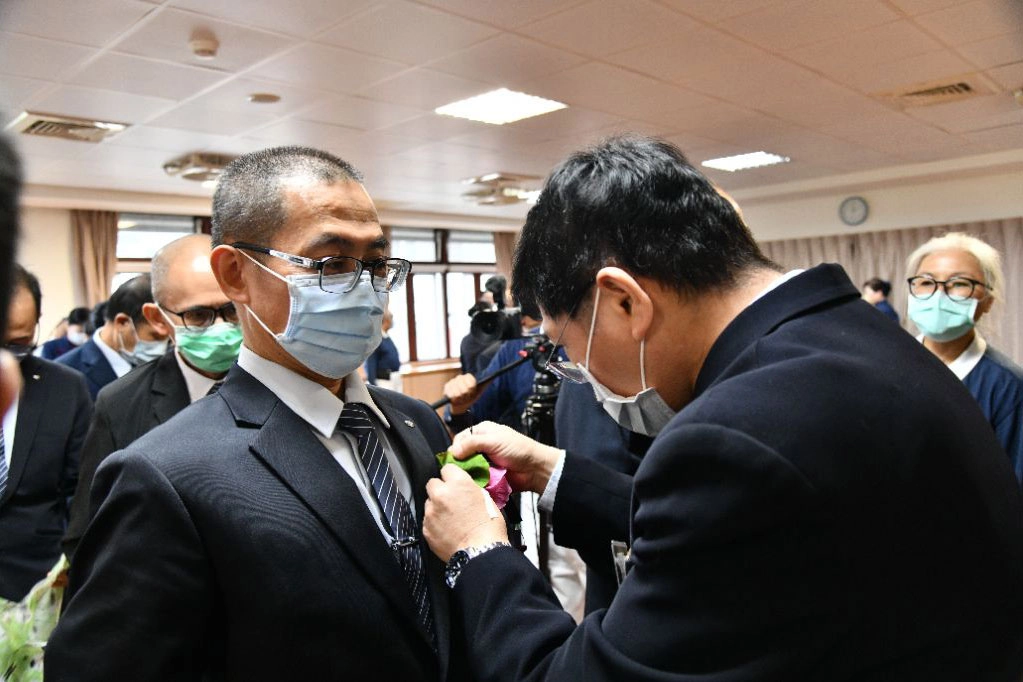 在授證暨歲末祝福感恩會正式啟幕前,資深志工為劉智銘親手佩戴上莊嚴的胸花。(攝影:梁榮為)