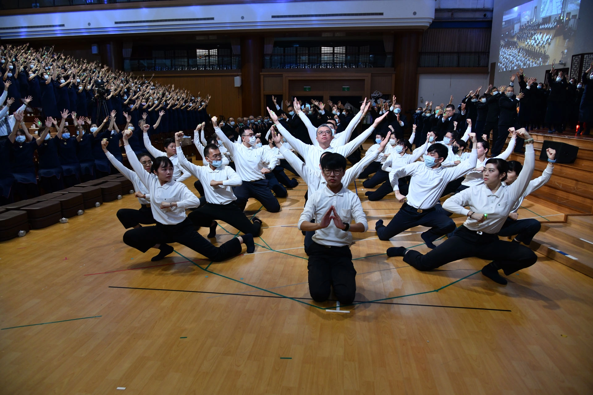 今年是胡昌輔(第三排左二)第二次站上上人場次的歲末祝福,與一群青年志工在舞臺上經藏演繹。(攝影:梁榮為)