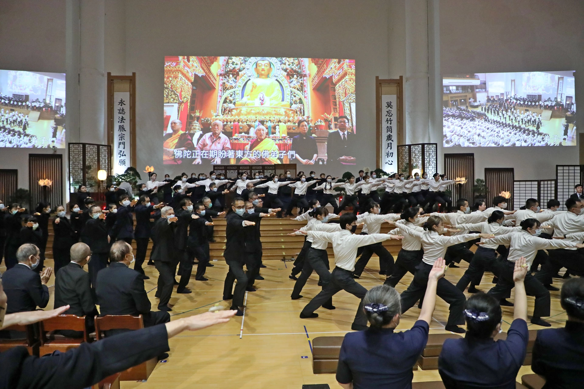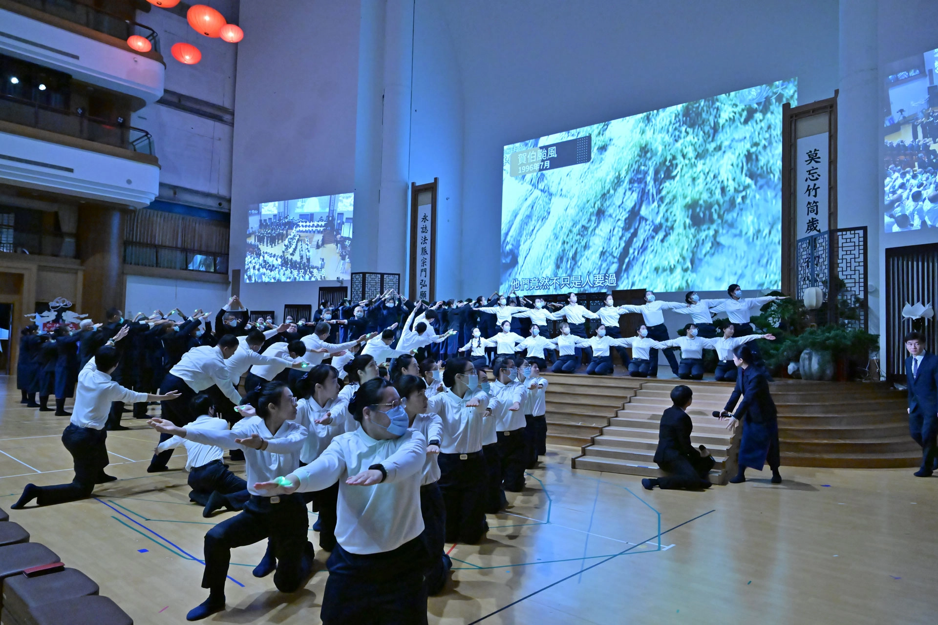 五個區域、跨越海峽的祝福,匯聚成同一分願,用整齊的步伐、純淨的心念與深沉的情感,共同呈現一場融合人文與修行的經藏演繹。從入場時的寧靜、排練時的默契,到正式演繹時的專注,每一位菩薩的眼神與動作,都像是在述說同一個方向──以身行道,為眾生祈福。