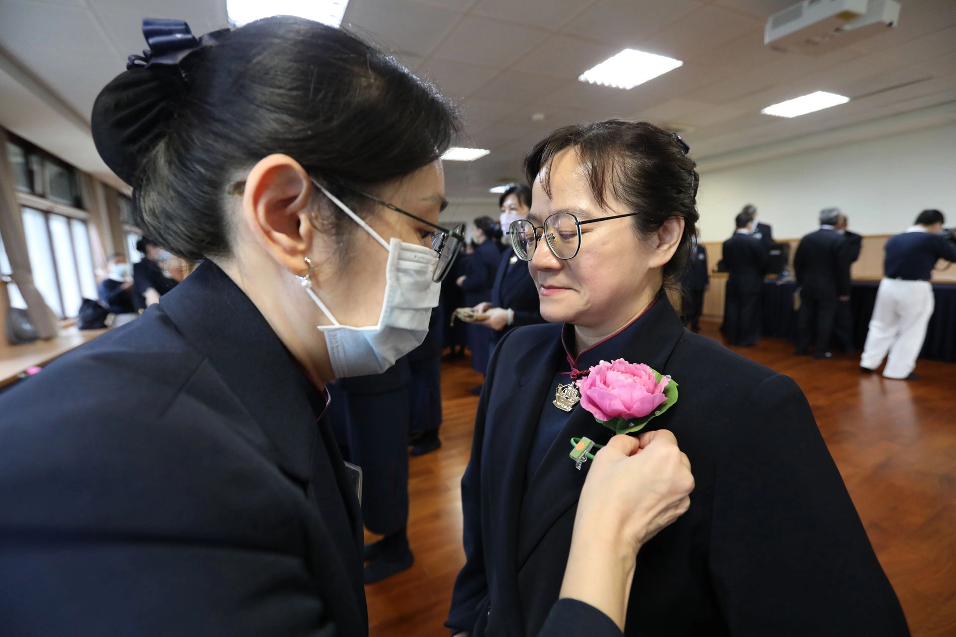 李書明別上胸花及「佛心師志」時,心中期許自己生生世世做慈濟、走在菩薩道上。(攝影:江寶清)