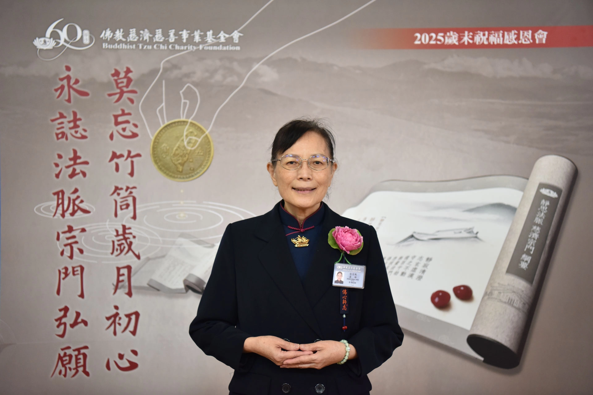 張容甄是2025年新受證委員,因身體健康狀況不佳,提前一年自臺大醫院行政工作退休。鄰近住家的溪洲里王山崎里長得知她退休後,邀請她到「溪洲社區關懷據點」擔任里民義工。由於據點中也有慈濟志工投入,且每次課程都會介紹慈濟或分享「證嚴上人說故事」,讓她因此逐步認識慈濟。