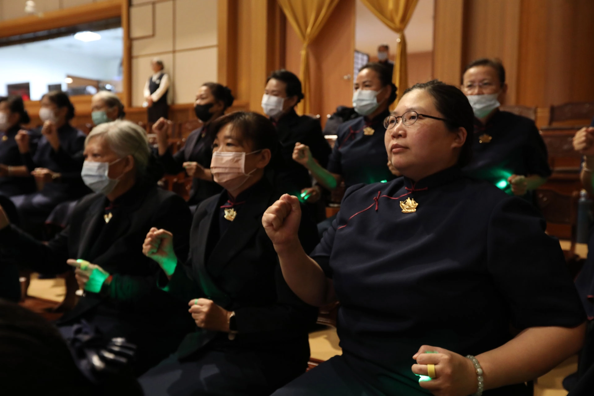 曾碧卿(前右一)回想2015年第一次在舞臺區演繹歲末祝福,此後十年多在法海區演出,也擔任知音種子,表示現在的動作已簡單易記。(攝影:江寶清)