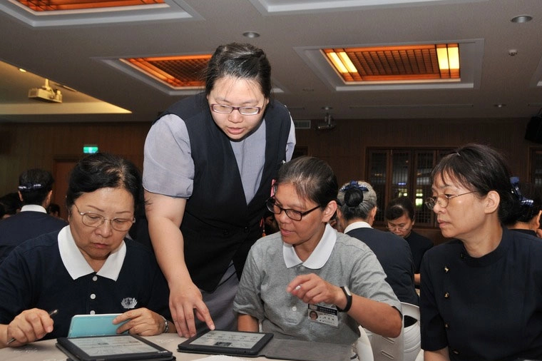 新北市雙和聯絡處電子書研習,曾碧卿師姊(左二)指導志工如何使用電子勸募本繳交功德款。(2016/05/22;攝影:黃曾幼馨)
