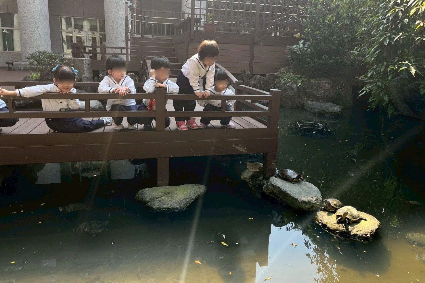 幼兒園外圍環境綠意盎然,周遭種植許多不同品種的樹木,並設有魚池,提供孩子觀察與接觸動物的機會。