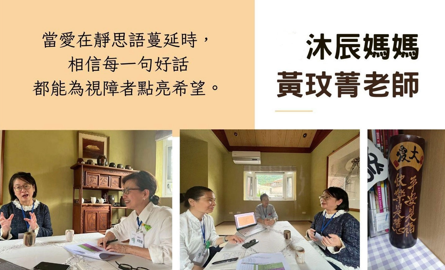 沐辰的母親是一名小學教師。二十多年前,她初任教職時,校園裡已有大愛媽媽入班說故事、分享靜思語,這深深影響了她的教育理念。她深知,有聲書與點字書對視障孩子而言,不只是輔助工具,更是通往世界的重要橋梁。
