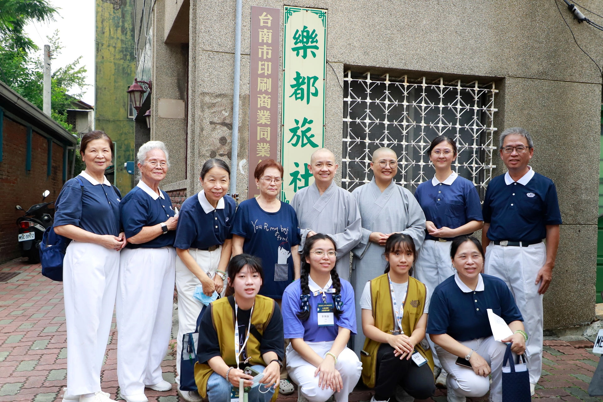 2025年8月24日是社會參與志工服務日,德格師父(後右四)、德深師父(後右三)及學員將觸角深入慈濟訪視,跟著志工到樂都旅社關懷照顧戶。(攝影:陳雪勤)