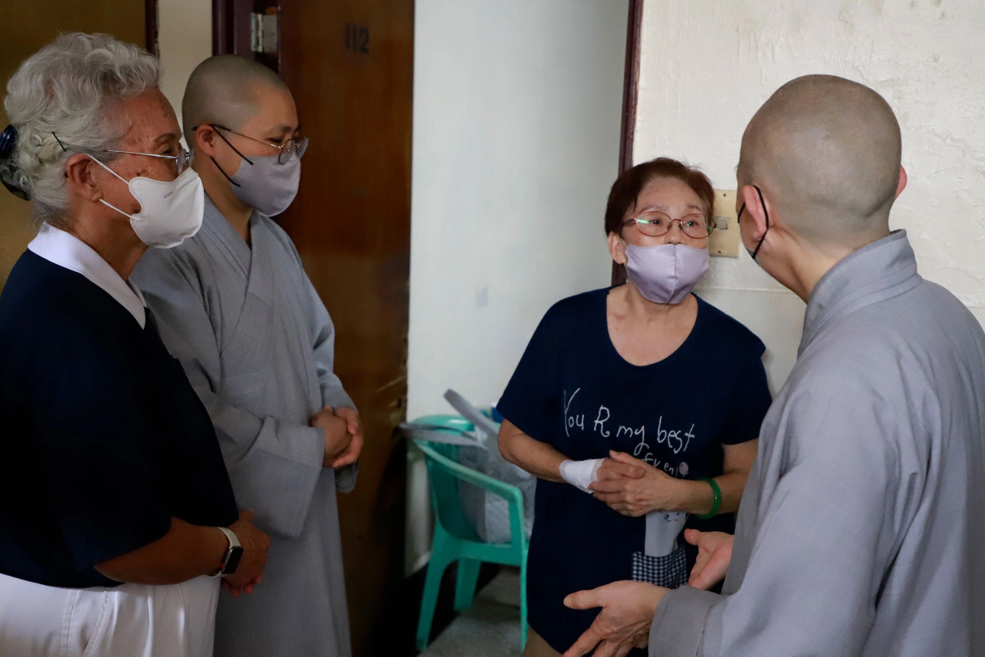 這兩年,志工觀察到住民長期累積的失意與負能量,於是在旅社裡舉辦了小型浴佛,邀請德深師父、德格師父帶領青年志工同行,將佛法與祝福親自送到住民身邊。師父看到住民體弱多病、缺乏營養,特別交代志工來訪時,提供慈濟穀粉滋養身體,這分關懷至今依舊。