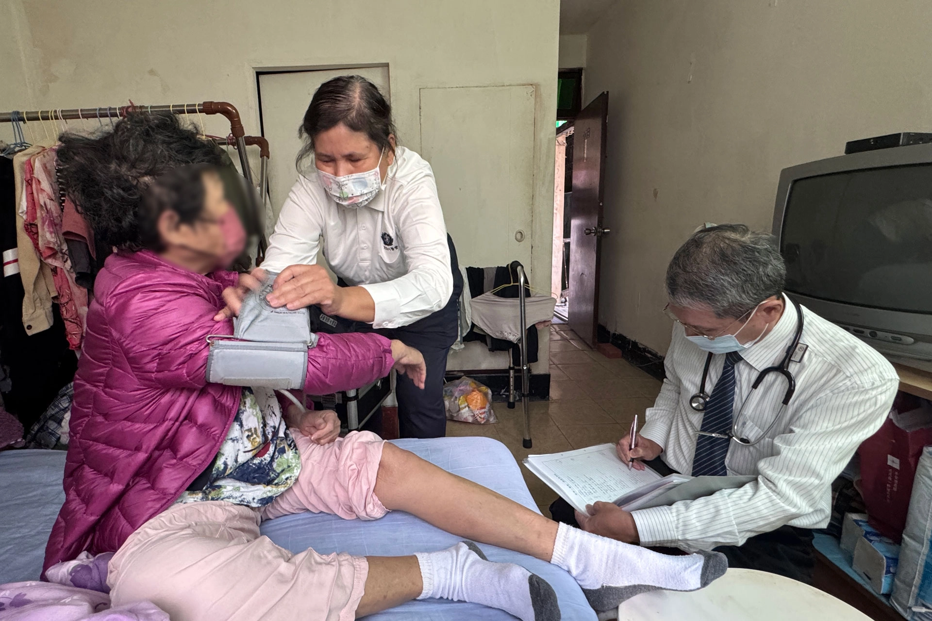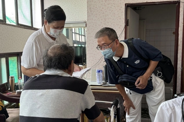慈濟人醫會與志工前往樂都大旅社進行往診服務,將醫療關懷與溫暖送進老舊卻充滿人情味的角落。志工林群超師兄(右一)問候照顧戶。(2024/10/30;攝影:許翠卿)