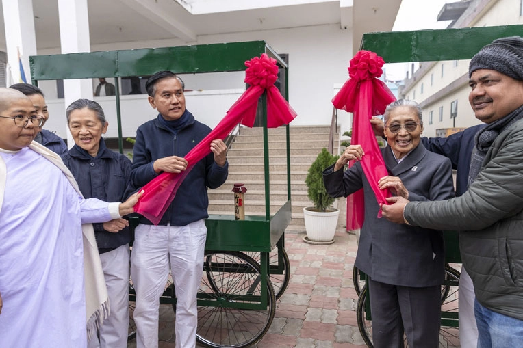 慈濟於菩提迦耶會所舉行手推車啟用儀式,說明以蔬食經營為原則,強調自立就業,並介紹「竹筒歲月」理念。(2025/12/24;攝影:蔡緗羚)