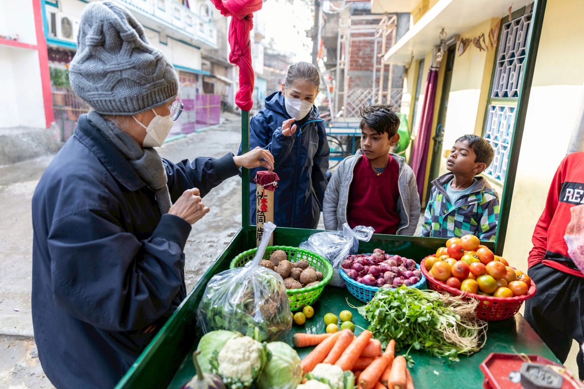 問她先生生意如何,他回答:「很好。到了下午,如果有賣不完的蔬菜,我就推出去沿街販賣。比較便宜的將它賣掉,每天都可以賣完。」話語間,孩子們擠在手推車前,露出燦爛的笑容。