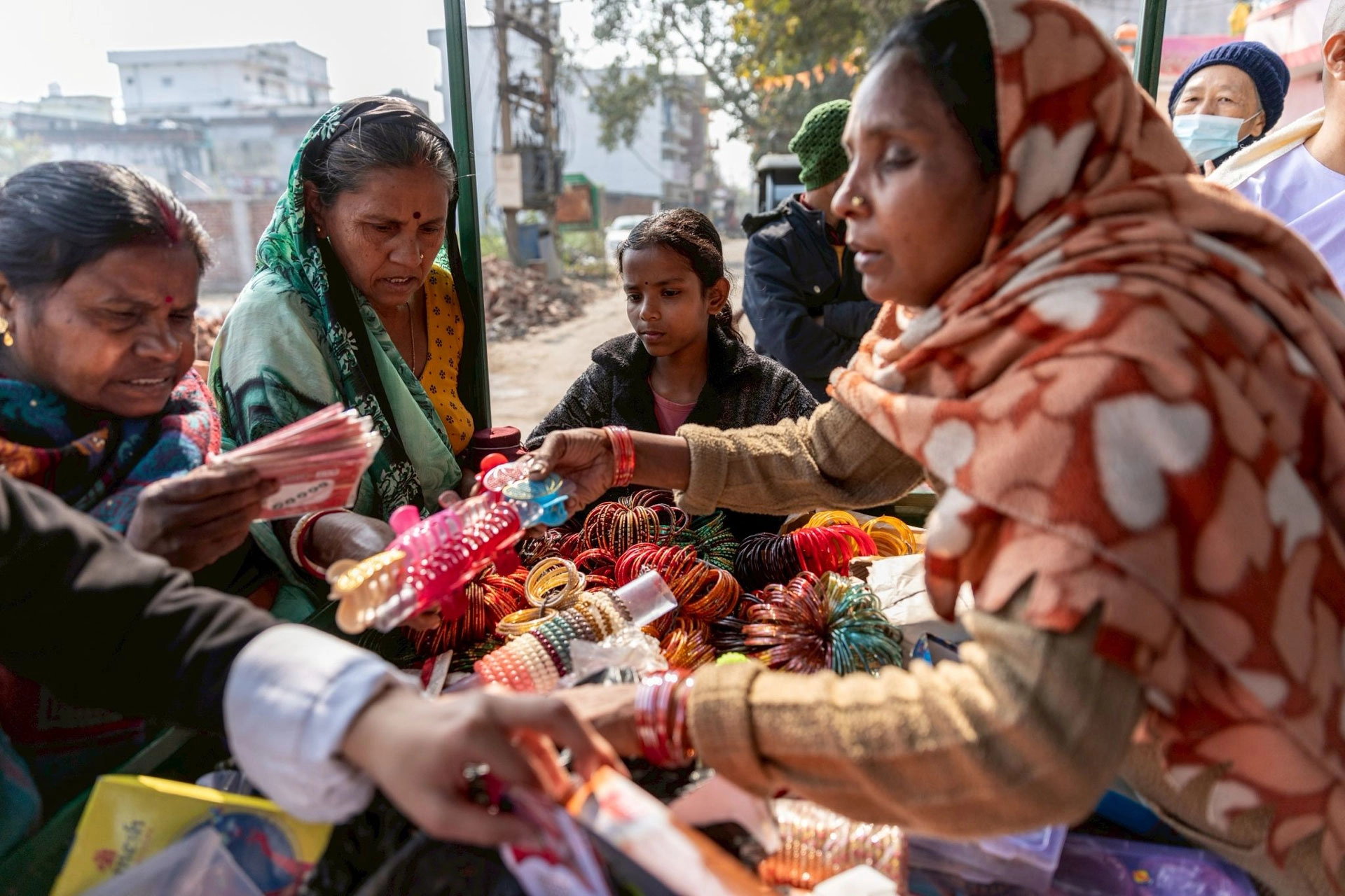 來到另一戶莎娜潔家,手推車上擺滿的飾品蒙上一層灰塵,這正是印度的日常。看見我們到來,她與先生歡喜迎接;不久後,夫妻倆帶著女兒,推著手推車,準備外出做生意。