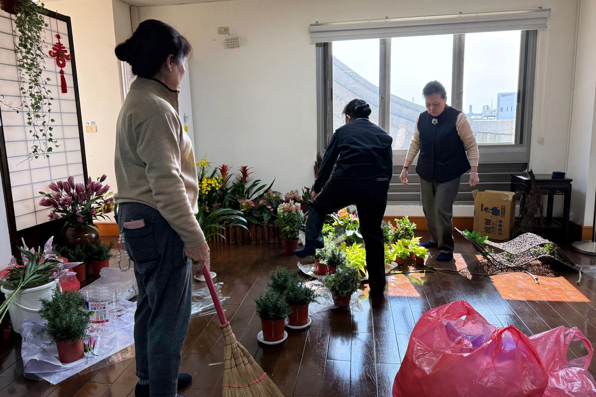 花材的準備同樣是一段用心的過程。多數花材事先至田尾選購與預訂,再由花店整批送至靜思堂。今年較為特殊的是使用了不少梅枝,公傳合心的劉桂梅師姊陪我一同前往南投信義鄉挑選。我們用噴漆在枝條上做了記號,梅枝的主人不僅分文未取,還細心依照標記鋸成所需的樣貌,再由彰化的師兄開著環保車載回。點滴過程,無不都是善的循環。