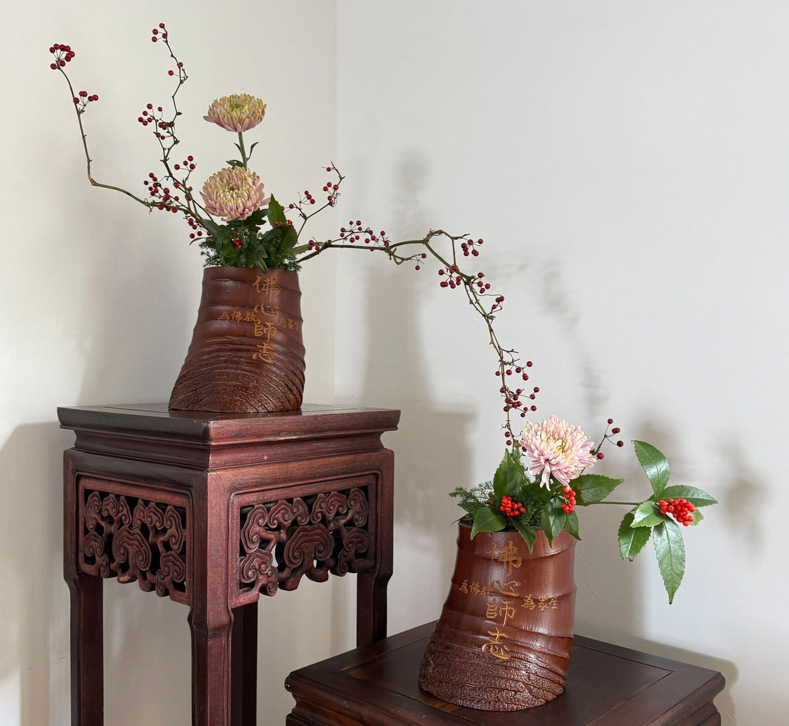 真正接下布置工作後,我才深刻體會到,「會插花」與「做布置」其實是兩種不同的專業。插花講究作品本身的結構與美感,而布置則需考量空間尺度、動線流向與整體氛圍。靜思花道一向重意境,作品多為素雅的家庭花品,並不全然適合大型空間的呈現。正是在這樣的過程中,我更加感恩能與素玉師姊搭檔。她的本業即是從事布置設計,經驗豐富、創意十足,與她搭檔的這些年來,她的建議與想法,往往正好補足我原本看不到的部分。