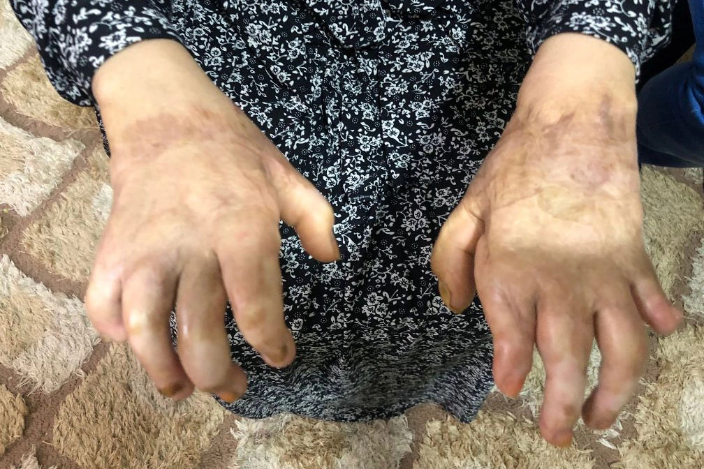 芮娜的雙手歷經九年治療、三十多次大小手術與復健後,僅剩微弱功能。(攝影:林綠卿)
