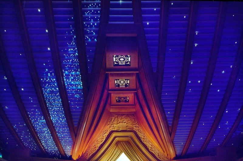 講經堂的「星空」,對應《慈悲三昧水懺序曲》:「夜闌長空燦爛,銀河繁星點點......緣起緣滅無常。」映照出星空深遠的意境。(攝影:劉森雲)