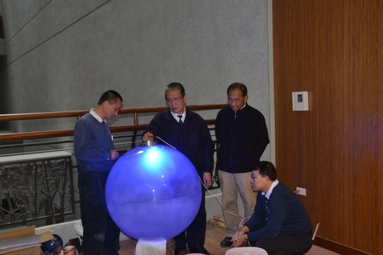 陳榮忠師兄(左)偕同黃文欽師兄(左二)以LED藍光測試地球內部的發光效果。(2013/01/03;攝影:溫忠漢)