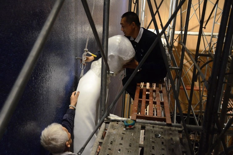 臺中分會新會所興建工程,慈濟志工合力進行宇宙大覺者的模擬安座。圖:陳榮忠師兄(右)確認宇宙大覺者的背後掛鉤是否牢固。(2012/12/18;攝影:溫忠漢)