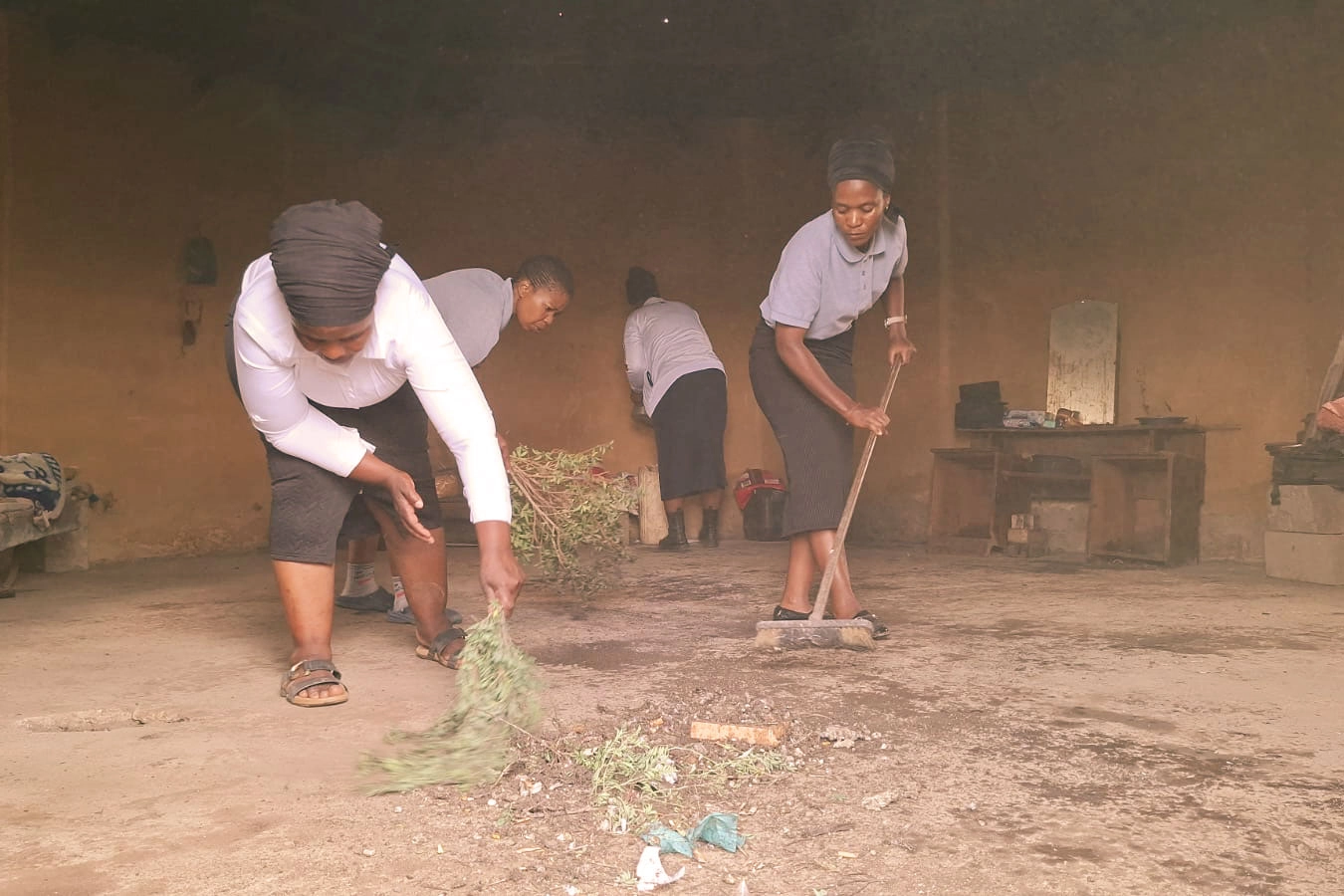 另一位53歲的 Hlangabeza Mkhize 因精神健康問題,居住環境與家禽混雜,生活條件十分艱困。志工們在協助清理居家環境時發現,他家裡甚至連掃帚都沒有。於是大家就地取材,以樹枝自製掃具完成清掃。