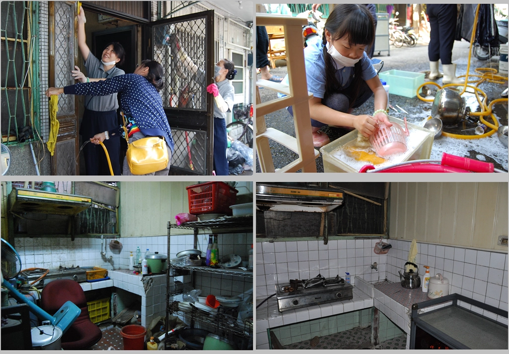老舊的木製建築,志工從二樓陽台以接力方式,清理出發霉帶有異味粉塵的寢具,並換上新的棉被組,汰換老舊常故障的冰箱,從中秋節前夕至中秋節當天,共花了三天時間,清理出滿滿的二輛環保回收車回收物,才把阿伯家整理乾淨。